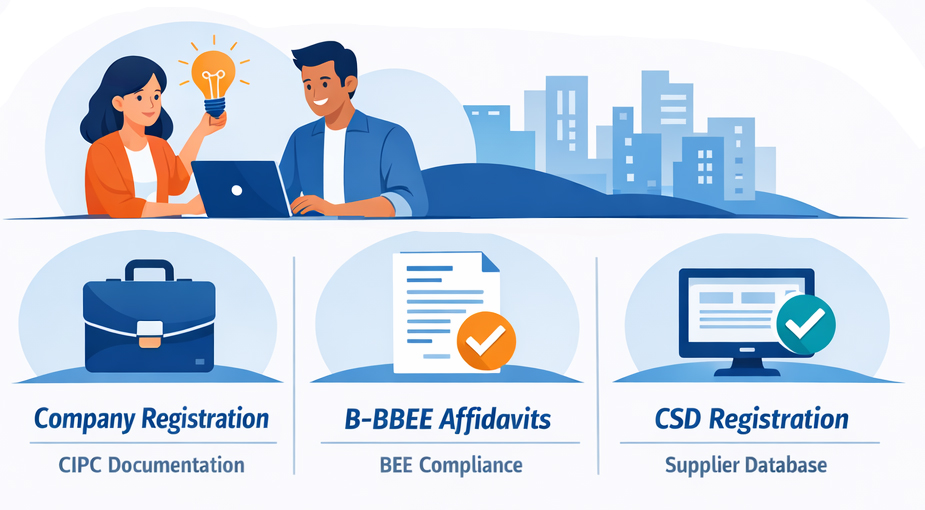 We understand that every successful business starts with a solid foundation. That’s why we go beyond just registration by offering essential startup services such as B-BBEE affidavits, CSD registration, and ongoing compliance support.